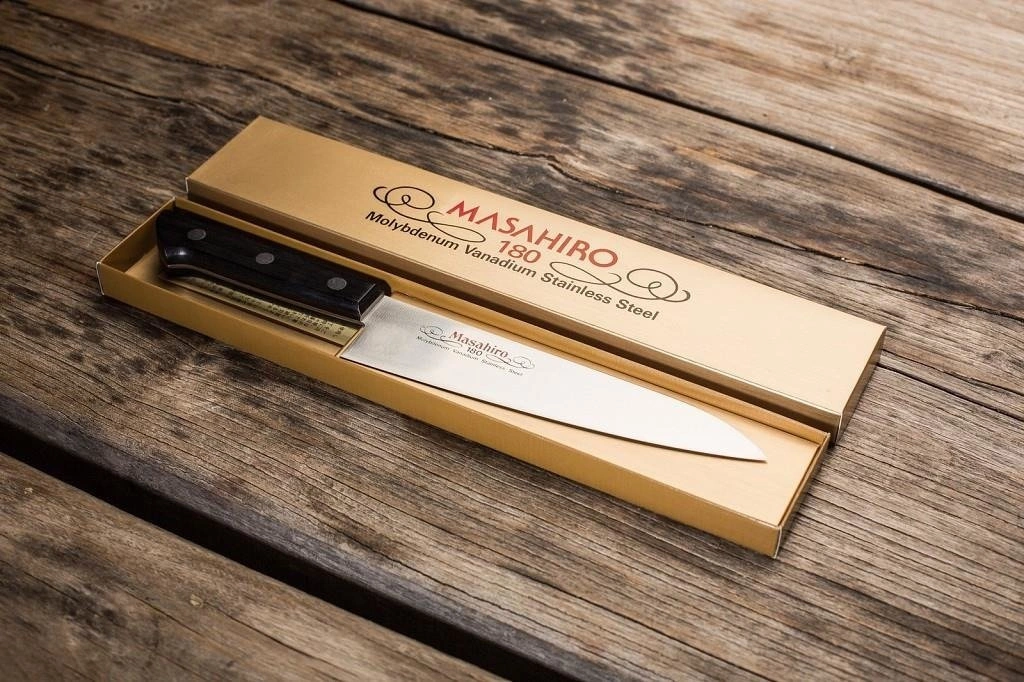 Wraz ze wzrostem twardości stali zmieniają się wymagania dotyczące ostrzenia noży kuchennych. Wysoki poziom HRC wymusza stosowanie kamieni do ostrzenia noży o lepszym i droższym ziarnie. Zwiększa się też poziom trudności w naostrzeniu takich noży i wydłuża się czas potrzebny na regenerację krawędzi tnącej. Zatem gdzie jest ten „złoty środek”? Dla każdego może być w innym miejscu, ale kuźnia Masahiro od dekad promuje swój sprawdzony i przetestowany przez wielu profesjonalnych Szefów kuchni. Ich autorska stal MBS-26 jest hartowana do 59 HRC, co z jednej strony daje nożom kuchennym ogromną agresywność cięcia, a z drugiej łatwość ostrzenia. Dodatkowo ostrzenie asymetryczne w stosunku 20/80, wzorowane na mieczach samurajskich, polepsza parametry krojenia wszelkich produktów spożywczych. Tym sposobem otrzymujemy wspaniałe noże kuchenne w przystępnej cenie.