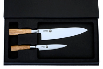 Zestaw składa się z dwóch niezbędnych noży. Jest tu zatem nóż szefa kuchni o długości 200 mm oraz jego mniejszy odpowiednik w postaci noża Utility o długości ostrza 120 mm. Utility to uniwersalne ostrze będące mniejszą wersją noża szefa kuchni. Ma wszechstronne zastosowanie dzięki czemu jest bardzo chętnie wybieranym ostrzem przez miłośników sztuki kulinarnej. Dodatkowym elementem kompletu jest eleganckie i ekskluzywne opakowanie kartonowe, idealne nadające się na prezent.